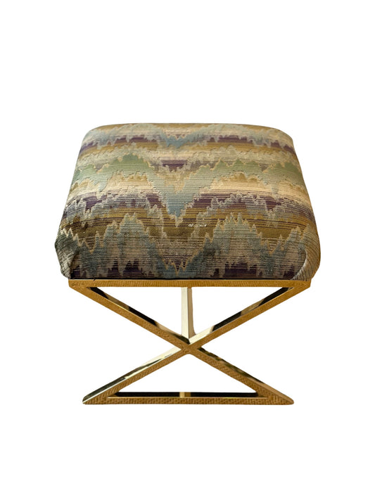 Brass X Ottoman in Schumacher Carpenter Flamestitch (Moss)