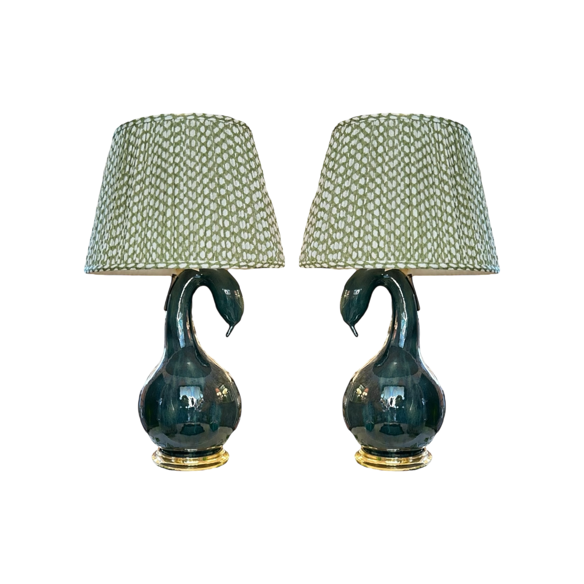 Gooseneck, alligator crackle, 23k gold water gilt base, brass double cluster, vellum paper shade.