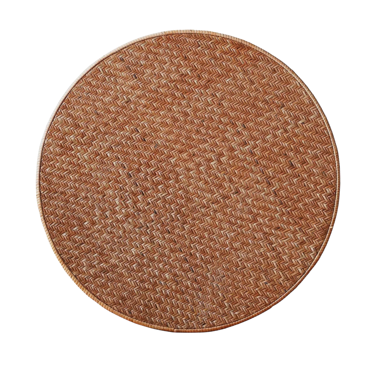 The legs and shelf framing are in a rich brown, which contrasts with the cognac-hued bamboo-weave tabletops and joint joins.