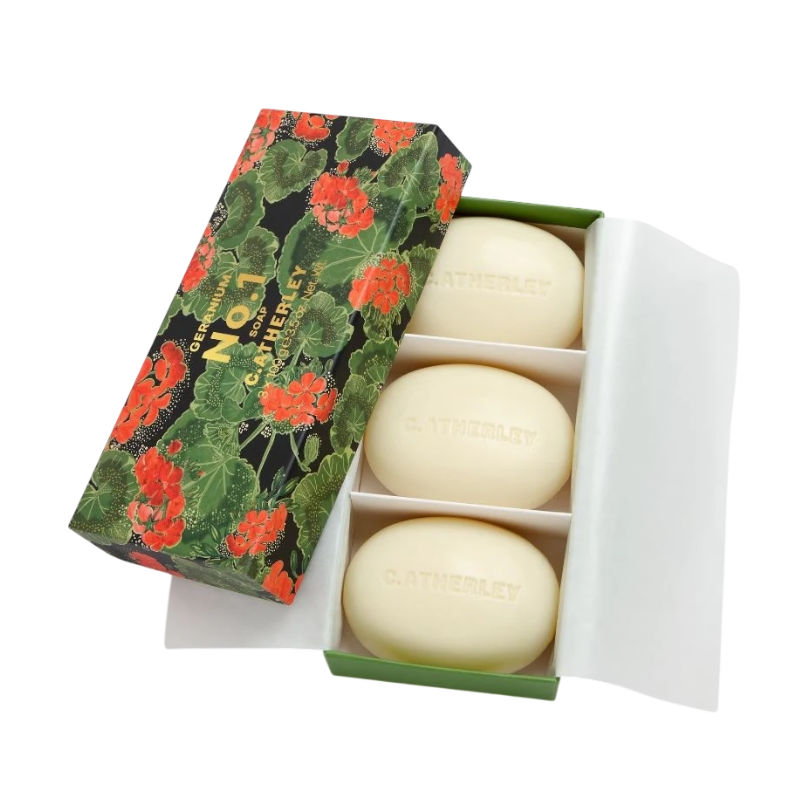 This set includes three hand-milled 100g soaps, beautifully boxed in the Uk and scented with our uplifting Geranium No.1 fragrance. Crafted with a high level of natural ingredients, including 100% certified sustainable palm oil, each soap moisturises and conditions skin, leaving it feeling silky smooth.