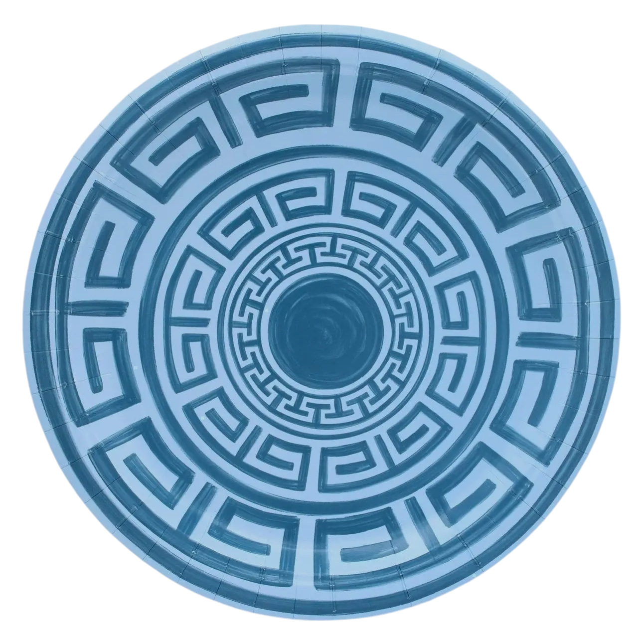 classic Greek Key design. This paper plate perfect for your next dinner party or family dinner at home. This stunning Navy and Sky design comes in 10.5 inch dinner plates and has 8 plates to a pack. Crafted with quality materials, these plates are durable and stylish, making them a must-have for any host.