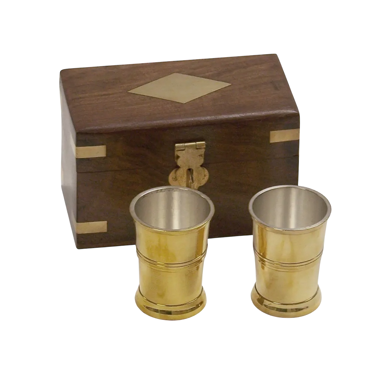 Two, 1-oz. polished brass rum cups have silver-plated interiors to make food-safe. Stored in a beautifully finished, solid rosewood (legally procured) storage box with polished brass inlaid accents on all corners, top and front latch. Perfect business gift, Christmas present to adorn any home or business wet bar, kitchen, dining area or commercial establishment.