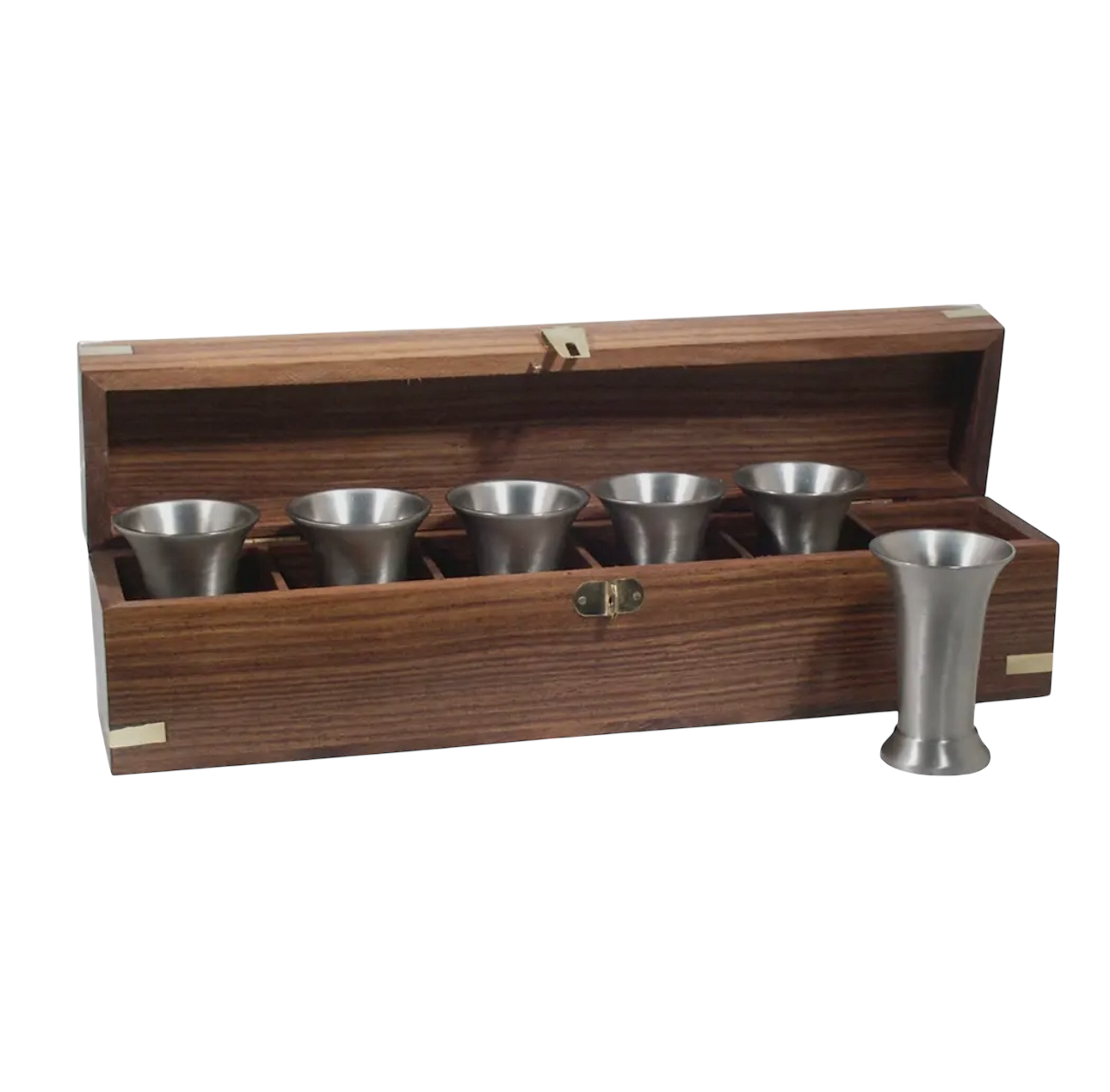 These six pewter plated beakers are neatly arranged in a 12" wooden box with brass inlay. Beakers are 2-3/4" tall.