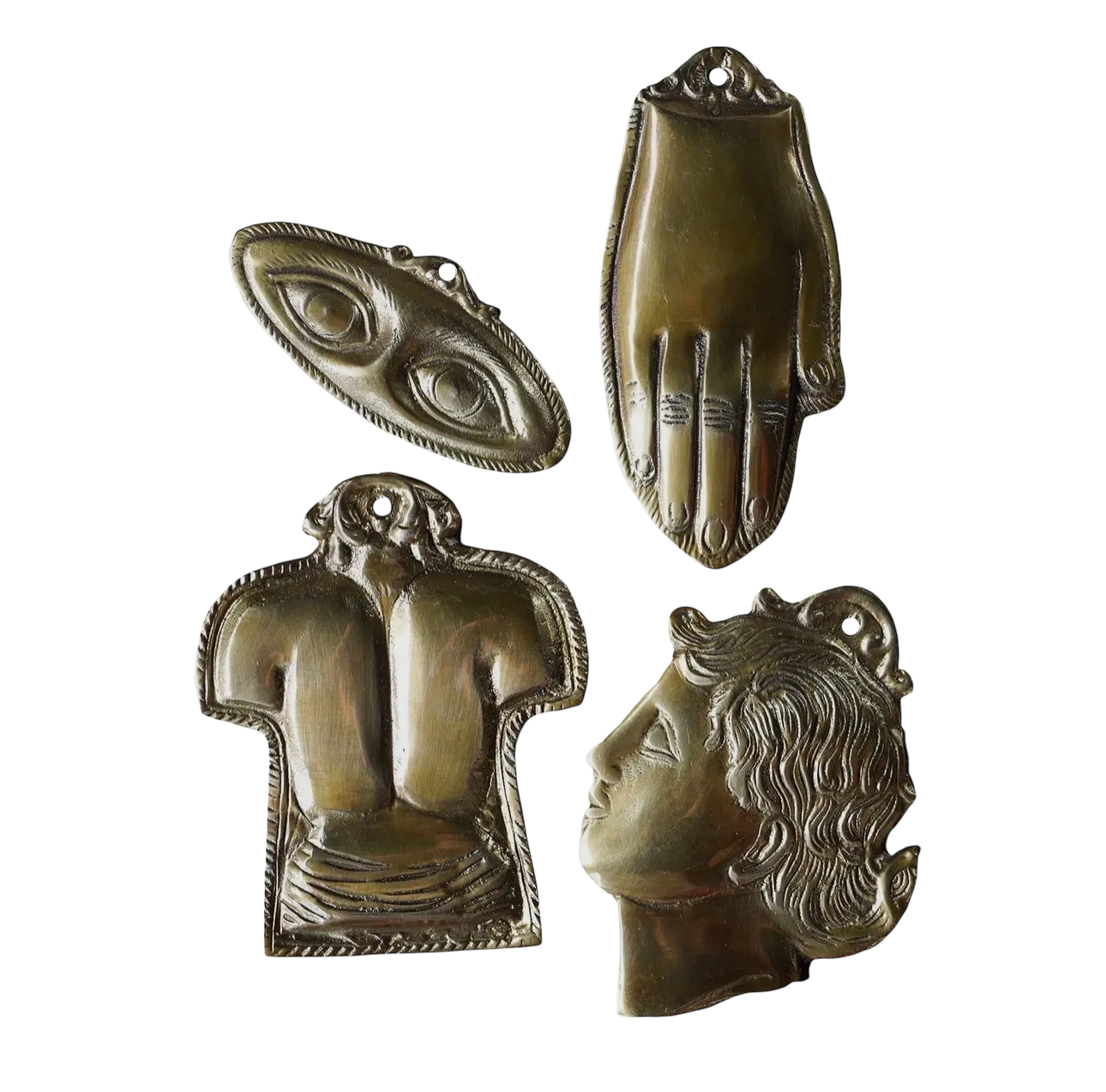 There is a single hand, eyes that appear to be peeping from behind a mask, a face in profile with an abundance of hair, and a chest and waist. Each solid brass ornament has a hole for lacing onto a chain.